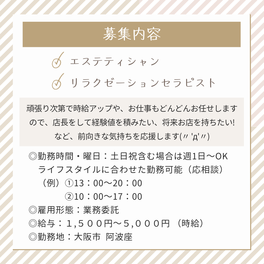 ・業務内容:脱毛、フェイシャルエステ、痩身、ヘッドスパ、オイルトリートメントと多岐に渡ります。その他サロンワークに付随する業務を担当していただきます。